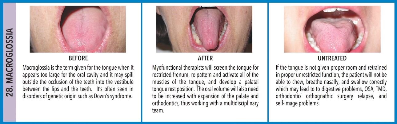 Orofacial Myofunctional Disorders are pathological conditions created by disruption of the functions of the stomatognathic system (teeth, jaws and associated soft tissues). These functions include chewing, breathing, swallowing, and head and neck posture. The following pictures describe the 32 clinical markers/syndromes associated with myofunctional disorders. A comprehensive myofunctional therapy program can address all of these concerns.